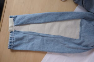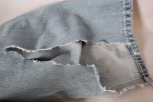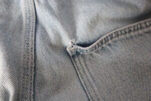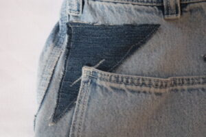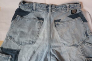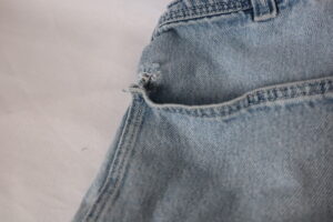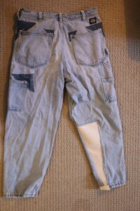 Jeans with tears from patch pocket at their corners and with major damage from bike sprocket to lower right leg and cuff. Patch pocket corners needing patched and reinforced. Right leg needing patch-panel, reinforcement, and alteration.