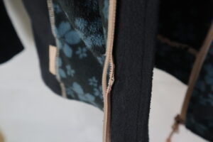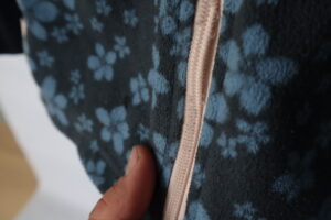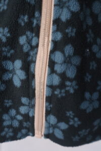 Fleece zipper teeth detaching from zipper backing making zipping difficult. Zipper teeth in danger of breaking. Zipper teeth reattached to backing using correct thread spacing on machine. Fixed zipper fully functional although not completely straight. Slight resistance upon zipping. Good repair. Client satisfied. -River S.